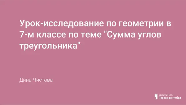 Урок геометрии в 7-м классе с использованием технологии моделирования проблемной ситуации. Урок-исследование по теме "Сумма углов треугольника". В ходе урока учащиеся самостоятельно выдвигают гипотезу о сумме углов треугольника, делают вывод о необходимости доказательства теоремы, доказывают ее, закрепляют полученные знания при решении задач. На уроке формируется один из самых важных навыков обучения - навык самостоятельного добывания знаний, умение мыслить логично, анализировать полученные знания.