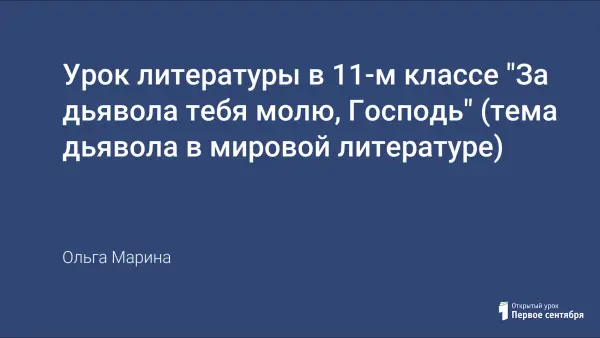 Представленный урок является вторым в системе уроков литературы в 11-м классе по изучению романа М.А. Булгакова "Мастер и Маргарита" (первый урок дается по теме "История создания и творческая история романа"). На данном уроке исследуется вопрос о том, как решалась в мировой литературе тема дьявола. Это позволяет включить роман Булгакова в контекст мировой литературы, определить, как решает этот вопрос Булгаков, наметить основные проблемы романа.