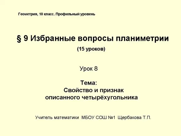 На уроке вводится понятие описанного четырехугольника иллюстрированием контрпримеров. При изучении теоремы закрепляется навык формулировки обратной теоремы, предложены задачи для первичного закрепления и контроля.