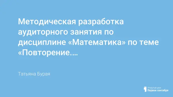 Методическая разработка аудиторного занятия по дисциплине «Математика» составлена для проведения учебного занятия, направленного на проверку и закрепление знаний студентов. Данный урок нацелен на повышение мотивации к обучению у студентов, в рамках одной пары уроков. Учебное занятие проводится в группах 1-го курса обучения. В занятие включены основные текстовые задачи на повторение.