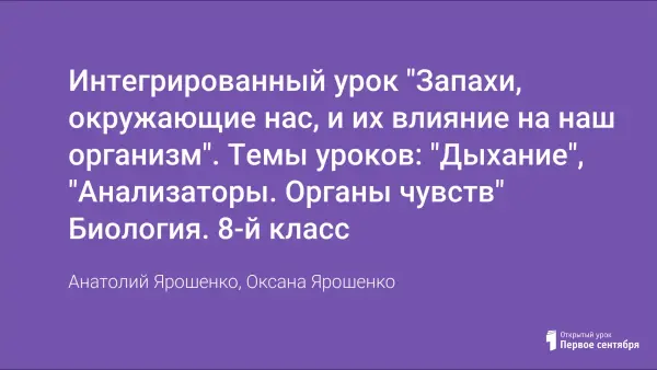 Интегрированный урок является продолжением других уроков интегрирования, вырастая в систему проведения таких уроков в курсе биологии (анатомии) 8-го класса. Порой человек не понимает смысла "запахи", пока не столкнется с ними вплотную. На этом уроке показано, чем чревата для организма человека окружающая его воздушная действительность.