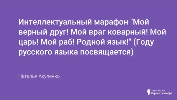 Программа интеллектуального марафона «Мой верный друг! Мой враг коварный! Мой Царь! Мой раб! Родной язык!». Цели - формирование ключевых компетентностей (сотрудничать в команде, выбирать тактику, принять решение в отведенное время), демонстрация эрудированности. Способствует интеллектуальному развитию лицеистов, расширяет знания учащихся по русскому языку, воспитывает чувство любви к русскому языку, развивает логическое мышление учащихся.