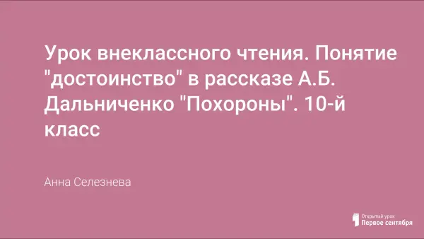 Цель урока: сквозь призму литературного произведения, героев показать основные нравственные категории, присущие каждому человеку. Такой урок проводится на местном литературном материале и знакомит с жизнью земляка – волгоградского писателя А.Б. Данильченко. Урок можно провести после изучения романа Л.Н. Толстого «Война и мир», когда учащиеся уже имеют представление о понятии «достоинства» в XIX веке.