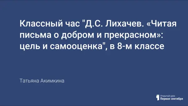 Д.С. Лихачёв является своеобразным символом русской интеллигенции XX века. На классном часе учащиеся знакомятся с биографией и творчеством Д.С. Лихачёва. Размышляют над статьёй «Цель и самооценка» из публицистической книги «Читая письма о добром и прекрасном», которая заставляет подумать о жизненно важных проблемах, определить своё отношение к нравственным ценностям, а также развивают навыки работы с публицистическим текстом. Материалы классного часа могут быть использованы и на уроках литературы в 8-м классе при изучении темы Д.С. Лихачёв «Земля родная».
