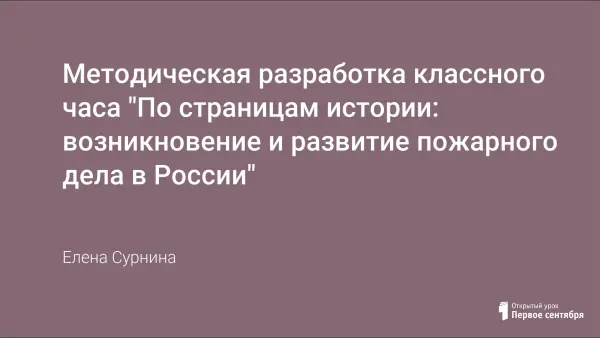 По мнению чешского педагога Яна Каменского, у детей есть две потребности: потребность в развитии и потребность в безопасности. Если первая в общем-то ясна, то вторая представляет особый интерес - например, в области пожарной безопасности. Одной из форм противопожарной пропаганды среди школьников является классный час. Предлагаемый вашему вниманию классный час открывает цикл внеклассных мероприятий по теме "По страницам истории: возникновение и развитие Пожарного дела в России".