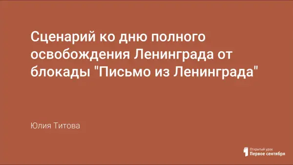 Сценарий ко Дню полного освобождения Ленинграда от блокады разработан с целью пробуждения у детей интереса к истории страны, к истории своего города, воспитания уважительного отношения к людям старшего поколения, к ветеранам Великой Отечественной войны.