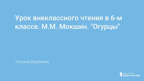 Урок внеклассного чтения проводится в 6-м классе по рассказу сельского учителя, поэта, нашего земляка М.М. Мокшина. В ходе урока через эпиграф и содержание рассказа "Огурцы" учащиеся проясняют смысл двухстрофного стихотворения – эпиграфа, анализируются языковые средства, используемые в тексте; продолжается обучение анализу текста. Урок развивает ассоциативно-образное мышление, предполагает домыслить написанное, развивает творческие способности учащихся. Тема анализируемого рассказа воспитывает у ребят доброту, человечность, уважение к старости.