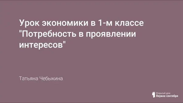 Урок экономики по теме "Потребность в проявлении интересов" разработан по тетради творческих заданий И.А. Сасовой "Экономика. 1 класс". Основная цель урока: формировать у детей представления о потребности в реализации интересов, в самовыражении. Достичь данной цели детям помогает Чебурашка, который решил выяснить, что такое экономика и чему дети уже научились за период обучения. Учитываются возрастные особенности первоклассников, в урок включены игровые моменты, проблемная ситуация.