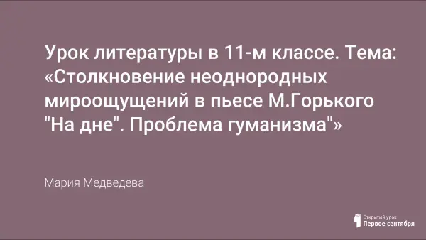 Урок способствует развитию критики и самокритики, культуры речи, логики мышления. Анализ и интерпретация художественного текста основывается на глубоком личностном восприятии, понимании, исследовании. Пьеса «На дне» осознаётся как литературное произведение, влияющее на современного читателя, зрителя, способствующее правильному нравственному выбору.