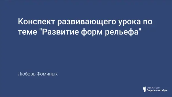 Урок «Развитие форм рельефа» (с применением электронной презентации) проводится в 8-м классе и завершает изучение раздела «Рельеф, геологическое строение и полезные ископаемые». Учащиеся знакомятся с эндогенными и экзогенными процессами, изменяющими рельеф России, через создание проблемных ситуаций. Слайды презентации используются в качестве иллюстрации, что помогает развивать наглядно-образное мышление.