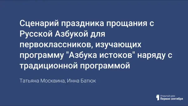 В статье описан опыт проведения праздника прощания с русской азбукой с учетом интеграции литературного чтения с курсом истоковедения в 1-м классе. Сценарий предполагает участие учащихся предыдущего выпуска начальной школы, что способствует преемственности и развитию дружественных отношений старших и младших товарищей.