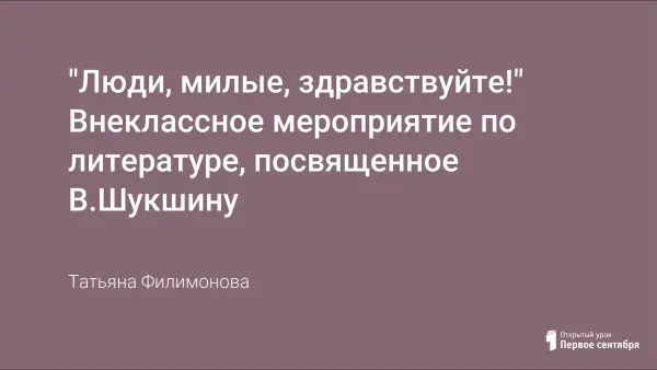 Данное внеклассное мероприятие направлено на пробуждение у учащихся старших классов интереса к творчеству В.Шукшина, знакомит с фактами биографии выдающегося человека. Советую сопровождать сценарий данного мероприятия кадрами из к/ф "Калина красная".
