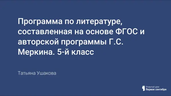 В статье представлена авторская программа, составленная на основе Федерального государственного образовательного стандарта основного общего образования, утвержденного приказом Министерства образования и науки РФ от 17.12.2010 г. N 1897, примерной программы по литературе, соответствующей ФГОС, авторской программы Г.С. Меркина, С.А. Зинина.