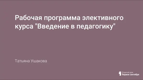 Предлагаемый элективный курс «Введение в педагогику» предполагает активизацию у старшеклассников процесса личностного, жизненного и профессионального самоопределения. Курс составлен на основе авторских учебников по педагогике и психологии (Н.В.Бордовская, А.А.Реан, И.Ф.Исаев, И.А.Зимняя, Е.Н. Шиянов, В.А.Сластенин, Н.Е.Щурковой и др.), раскрывает основные направления деятельности учителя.