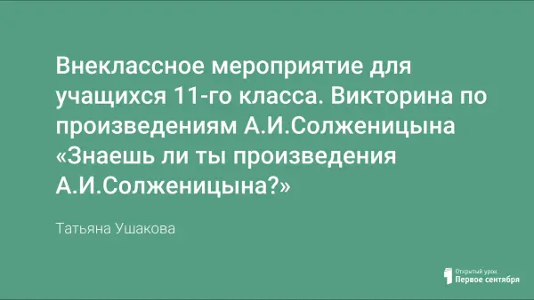 Внеклассное мероприятие «Викторина по произведениям А.И.Солженицына «Знаешь ли ты произведения А.И.Солженицына?»» позволяет учащимся 11-го класса закрепить материал по теме «Творчество А.И.Солженицына» в игровой форме. Занятие построено на основе использования методики «полетного» повторения (системы постоянного попутного повторения изученного), проблемного обучения, индивидуальной и групповой работы, что позволяет эффективно закрепить изученный материал.
