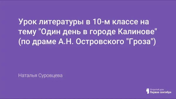 Урок литературы в 10-м классе на тему «Один день в городе Калинове (по драме А.П.Островского «Гроза»)» проходит в форме необычной экскурсии в XIX век. На протяжении всего урока главными гидами являются – литература, живопись, музыка, театр. С помощью этих необычных средств десятиклассники узнают много любопытного о городе Калинове и его обитателях. В ходе урока ученики знакомятся с миром купечества, учатся раскрывать различные стороны конфликта, участвуют в театрализации жизни героев изучаемого произведения. Изучение темы урока в необычной форме способствует развитию творческих способностей и возможностей обучающихся, воспитывает художественно-эстетический вкус старшеклассников и их читательскую культуру.