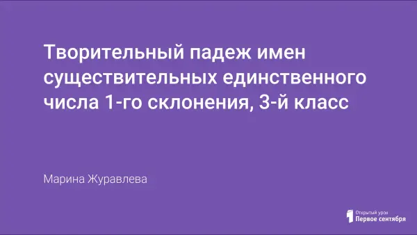 На уроке раскрывается значение слова «творительный», даётся понятие об определении окончаний имён существительных ед.ч. 1 скл. Т.п., о предлогах Т.п. и о том, каким членом предложения являются существительные Т.п. Используется фронтальная и групповая работа.