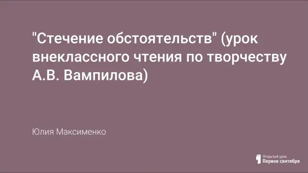 Творчество А.В. Вампилова изучается в старших классах. На уроках литературы говорят в основном о его пьесах. Но у этого автора есть и рассказы. Урок внеклассного чтения "Стечение обстоятельств" в 6-м классе нацелен на знакомство с творчеством Вампилова-писателя.