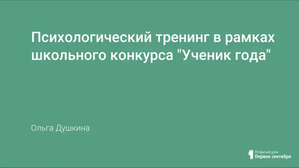 Тренинговое занятие разработано специально для школьного конкурса «Ученик года» и охватывает три основные компетенции в развитии личности – интеллектуальную, коммуникативную и развитие лидерских качеств. Подбор упражнений психологического тренинга позволяет учащимся учиться искусству презентовать себя: проявить себя.