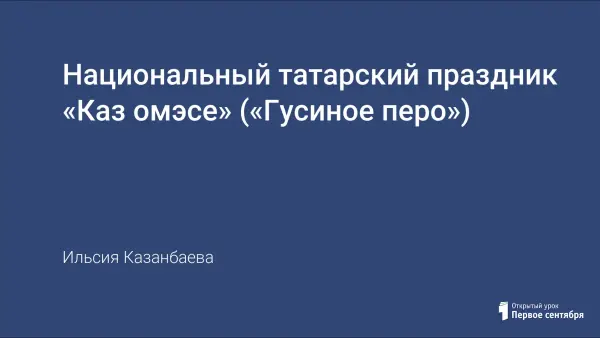Электронная презентация посвящена традиционному национальному празднику татар и башкир "Каз омэсе" ("Праздник гусиного пера"). Презентация знакомит с народным праздником, традициями, обычаями, самобытной культурой, воспитывает уважительное отношение к народным традициям. Материал рекомендован для использования во внеклассной работе.
