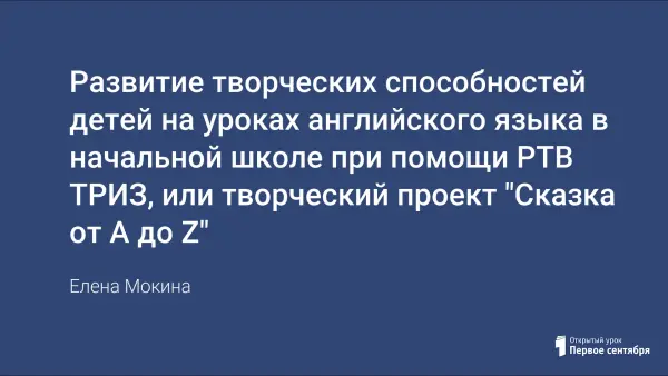 В своей педагогической практике я обратилась к системе развивающего обучения с направленностью на развитие творческих качеств личности по Г.С. Альшуллеру, в частности к использованию приемов РТВ ТРИЗ, т.к. она способствует развитию творческого воображения и учит фантазированию. Мы сами пишем сценарии сказок, используя различные приемы РТВ ТРИЗ: системный оператор, учебный "мозговой штурм", метод контрольных вопросов, морфологический анализ, бином фантазии, метод фокальных объектов и др. Вся эта работа проходит в рамках творческого проекта "Сказка от А до Z".