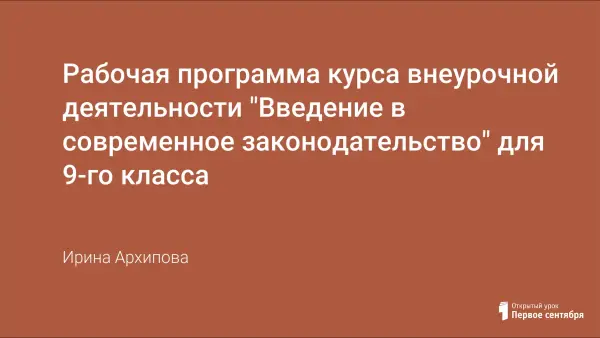 Курс внеурочной деятельности «Введение в современное законодательство» реализует интересы обучающихся 9-х классов в углублении и систематизации правовых знаний, необходимых для успешной социализации, социальной коммуникации и взаимодействия. Рабочая программа содержит планируемые результаты освоения курса внеурочной деятельности, содержание курса в форме перечня базовых понятий и знаний, списки литературы и ресурсов Интернет.