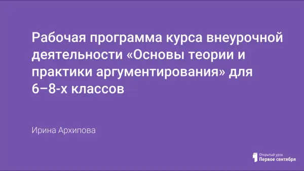 Курс внеурочной деятельности «Основы теории и практики аргументирования» прикладным курсом, реализующим интересы обучающихся 6–8-х классов в сфере социальной коммуникации и взаимодействия. Рабочая программа включает в себя пояснительную записку, планируемые результаты освоения курса внеурочной деятельности, содержание курса в форме перечня базовых понятий и знаний, списки литературы и ресурсов Интернет.
