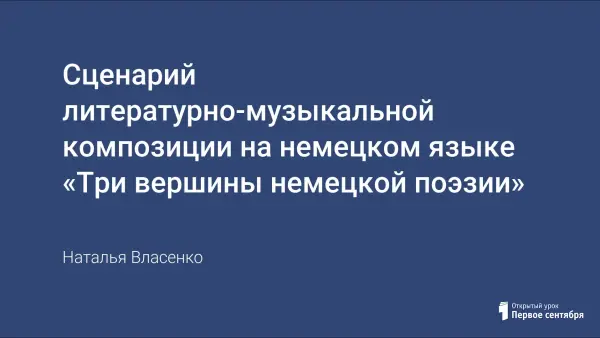 Композиция знакомит с краткой биографической информацией о трех величайших поэтах Германии: Й.В.Гете, Ф.Шиллере и Г.Гейне, и c их стихотворными произведениями, доступными учащимся среднего звена, как тематически, так и в языковом отношении. Композиция сопровождается музыкой великих немецких и австрийских композиторов: В.А.Моцарта, Л. ван Бетховена, Ф.Шуберта. Творчество немецких поэтов рассматривается в контексте диалога и взаимообогащения культур наших народов.