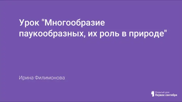 На занятии учащиеся знакомятся с представителями класса паукообразных на примере отрядов “Скорпионы”, “Пауки”, “Клещи” и “Сенокосцы”; с их значением в природе и для человека. Материал для урока может использоваться в зависимости от технических возможностей учителя.
