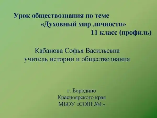 Урок поиогает получить представление о сущности духовного мира личности и его значении для современного общества, формирует отношение к духовной жизни общества. Разнообразные формы и способы, используемые на уроке, повышают познавательную активность учащихся, воспитывает коммуникативность, толерантность в общении с другими, развивают умения сопоставлять, рационально решать познавательные и проблемные задачи.