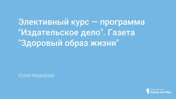 Программа элективного курса предназначена для учащихся 9-х классов, направлена на ориентацию гуманитарного, информационно-технологического профиля. Курс рассчитан на 14 часов, по 1 часу в неделю. Издательское дело – интегрированный межпредметный курс, цель которого – создать базу у учащихся в мире профессий, точнее, дать возможность получения теоретических знаний и практических навыков в создании печатной продукции (школьной газеты, тематических приложений к школьной газете, буклетов и т.д.)