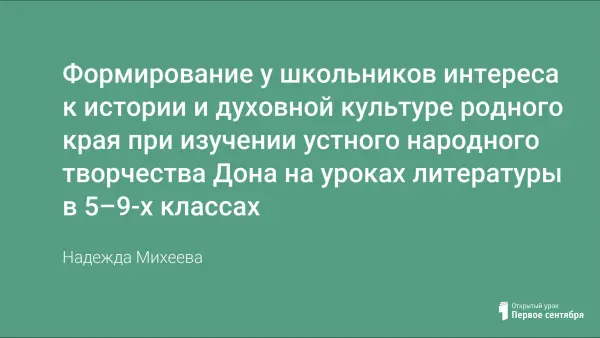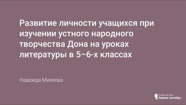 Уроки в 5–6-x классах, знакомящие с донскими казачьими и народными сказками, призваны научить учащихся понимать мир этих сказок, видеть приметы времени, народного уклада жизни, национального характера, верований, научиться понимать и воссоздавать поэтику сказки.
