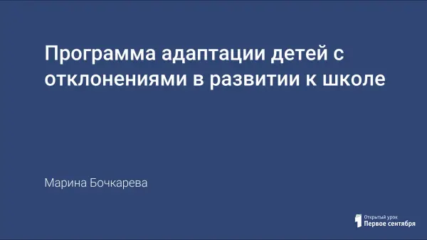 Данная работа посвящена адаптации детей с отклонениями в развитии к школе. С приходом в школу ребенок попадает в новые социальные условия. Меняется привычный образ жизни, возникают новые отношения с людьми. Смена окружения может сопровождаться повышением тревожности, нежеланием общаться с окружающими, отгороженностью, снижением активности.