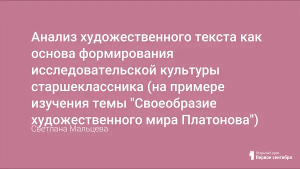 Познавательная активность формируется на основе творческой инициативы, навыков самостоятельного движения в информационных полях, на основе развития рационально-логической и эмоционально-образной составляющих мировоззрения личности. Комплексный анализ художественного теста, лингвистические и литературоведческие задания аналитического характера на основе сравнения, сопоставления, синтеза формируют исследовательскую культуру старшеклассников. В рамках вопроса представлен комментированный конспект урока по теме "Своеобразие художественного мира Платонова".