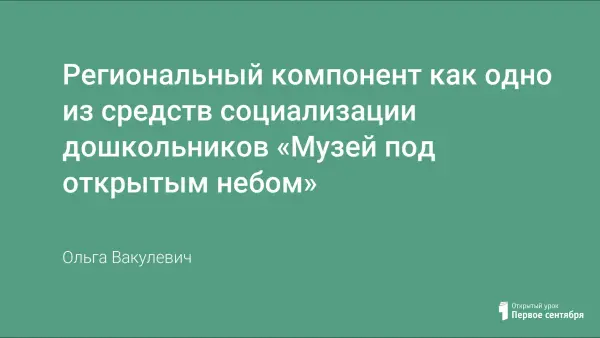 Региональный компонент как одно из средств социализации дошкольников включает знакомство с родным краем в образовательном процессе, в который гармонично вписывается краеведческий материал. «Музеи под открытым небом» создаются на основе недвижимых памятников истории и культуры на месте их нахождения и в природном окружении или на основе перевозки памятников на специально отведенную территорию из других мест.