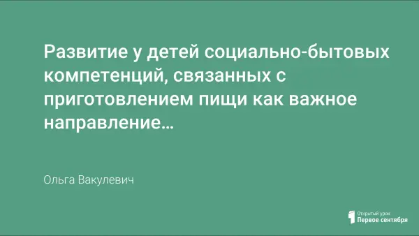 Проблема раннего формирования компетентности правильного здорового питания у дошкольников актуальна, своевременна и достаточно сложна. Известно, что дошкольный возраст является решающим в формировании фундамента физического и психического здоровья. Важно на этом этапе сформировать у детей базу знаний и практических навыков о здоровом питании, о здоровом образе жизни, в том числе осознанную потребность ежедневного применения этих знаний. Социально-бытовая компетенция рассматривается исследователями как совокупность знаний о социальном и предметном мире, умений осуществлять социальное взаимодействие с взрослыми, сверстниками и продуктивную деятельность с объектами реальной действительности.