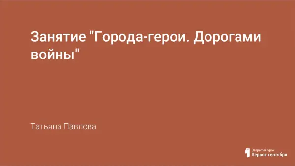 Цель занятия: познакомить детей с городами-героями, с событиями войны 1941–1945 гг., показать роль Советской армии в освобождении страны от немецко-фашистских захватчиков, воспитывать чувство гордости за свою Родину, формировать нравственные качества, такие как сострадание, милосердие, сочувствие. В основу подготовки занятия была положена поисковая работа детей.