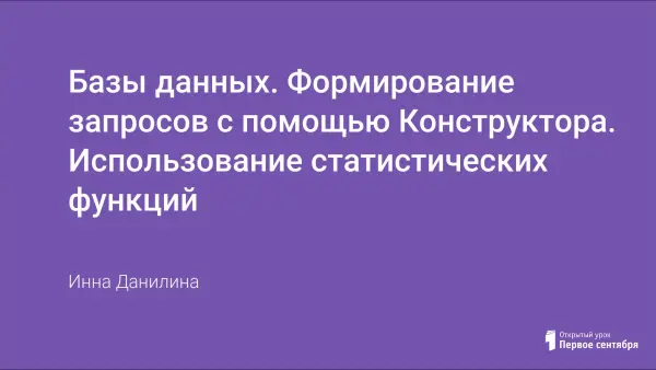 Данный урок построен на деятельной основе. Большая часть урока – самостоятельная практическая работа, выполняя которую учащиеся на практике закрепляют приемы реализации запросов на выборку с помощью Конструктора запросов MS Access, использование статистических функций (Count, Avg, Min, Max).