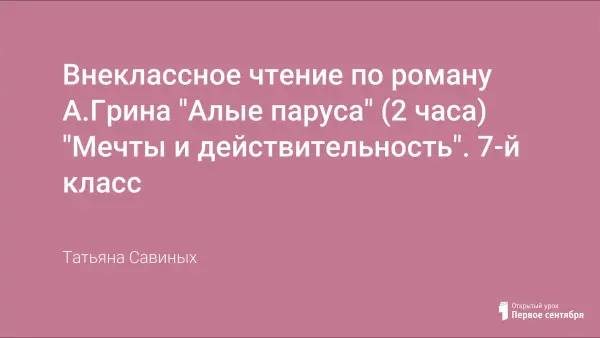 В работе приводится подробный конспект урока с постановкой проблемного вопроса: способен ли человек совершать чудеса своими руками? Чтобы решить проблемный вопрос, рассматривается роман-феерия Грина в трёх аспектах: мир А.Грина, мир Ассоль, мир Артура Грэя.