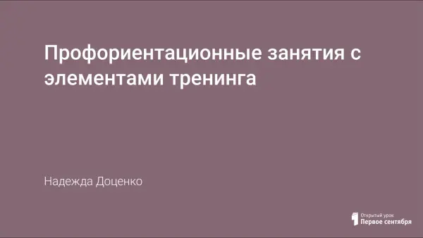 Занятие «Мир профессий», седьмое в профориентационной программе «Формирование адекватной самооценки старшеклассников как приоритетный фактор успешного профессионального самоопределения учащегося». На протяжении всего занятия учащиеся знакомятся с типами профессий, с требованиями к образованию, профессионально важными качествами специалистов и содержанием труда той или иной специальности.