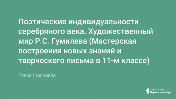В мастерской использованы методы эвристического исследования, смысловых ассоциаций, образного видения и др. Предполагается, что к окончанию урока учащиеся будут знать основные черты лирического героя Н.Гумилёва, своеобразие поэтического мира, особенности модернистского течения – акмеизма; смогут выполнить творческую работу обобщающего и рефлексивного характера. Материал сопровождается презентациями.