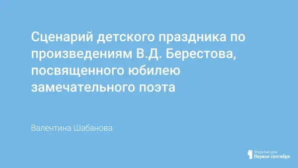 Представлен сценарий детского праздникапо произведениям В.Д. Берестова, посвященного Юбилею замечательного поэта.