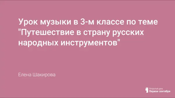Урок начинается с мотивации детей, показ различных предметов быта, которые использовали в качестве музыкальных инструментов. В течение урока проводятся микроисследования, которые объясняют деление музыкальных инструментов на группы в соответствии с различными способами извлечения музыкальных звуков: ударные, духовые, струнные. Прослушав звучание русских музыкальных инструментов в отдельности и в целом оркестр, в конце урока дети создают свой собственный оркестр из простейших музыкальных инструментов.