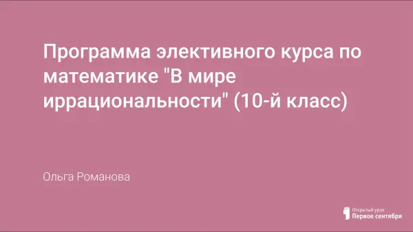 Предлагаемый курс является развитием системы ранее приобретённых программных знаний. Программа содержит три основных блока, связанных с понятием «иррациональность».