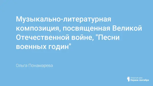 Музыкально-литературная композиция «Песни военных годин» предназначена для учащихся 5–8-х классов, способствует формированию положительной нравственной оценки подвига во имя Родины, воспитанию чувства патриотизма, формирует потребности знать и помнить исторические события, стимулирует интерес к чтению художественной и исторической литературы, связанной с военной тематикой.