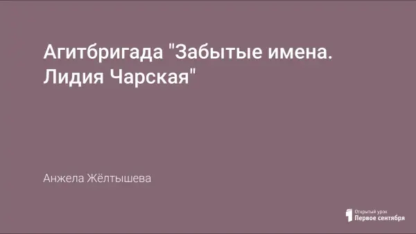 В статье представлены материалы для агитбригады «Забытые имена» о Чарской Лидии Алексеевне (урожденная Воронова, в замужестве Чурилова) – писателе начала ХХ века. Она была самой популярной детской писательницей начала XX столетия. Потом её имя было забыто. О Чарской вспомнили в 90-е годы XX века. Безусловно, книги Чарской найдут своего читателя, её полюбят маленькие и юные российские граждане России XXI века. Такова идея агитбригады.