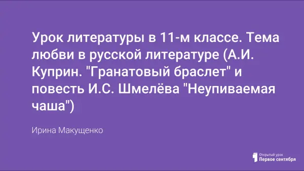 Представлен конспект урок литературы в 11-м классе по теме: "Тема любви в русской литературе" (по рассказу А.И. Куприна "Гранатовый браслет" и повести И.С. Шмелёва "Неупиваемая чаша").