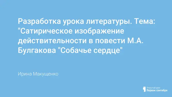 Данный урок предполагает повторение жанров сатиры, анализ повести М.А. Булгакова "Собачье сердце" с целью выявления особенностей данного произведения, раннего творчества писателя, раскрытия картин действительности 20-х годов двадцатого столетия. Через анализ эпизодов повести совместно с учениками понять отношение автора к событиям в жизни России в начале века. Одноимённый фильм по повести М.А. Булгакова "Собачье сердце" режиссёра Владимира Бортко, эпизоды которого используются на уроке, поможет в достижении поставленных целей.
