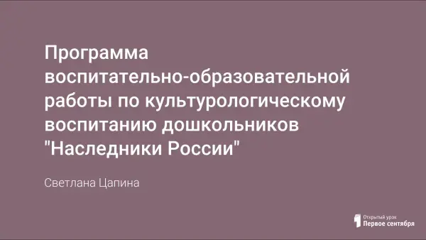 В статье отражена программа воспитательно-образовательной работы по культурологическому воспитанию дошкольников "Наследники России" МДОУ "Детский сад общеразвивающего вида № 17" г. Щёкино Тульской области.
