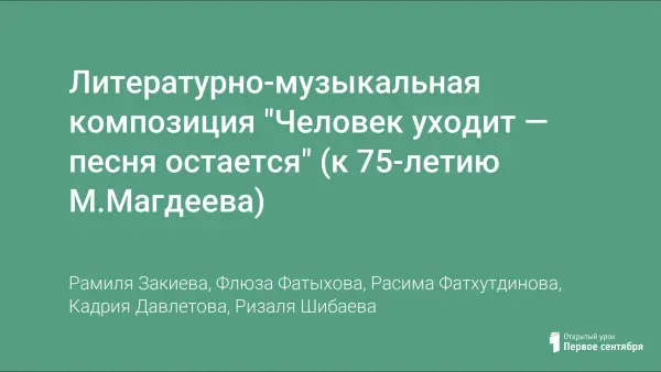 Представленная литературно-музыкальая композиция посвящается 75-летию со дня рождения татарского писателя Мухаммета Магдиева. Данное внеклассное мероприятие раскрывает жизненный и творческий путь писателя, проиллюстрированный самыми яркими и значительными событиями его жизни. Использованы инсценированные отрывки, фрагменты из произведений писателя, воспоминаний студентов и поклонников его таланта, фрагменты музыкальных произведений. Мероприятие сопровождается компьютерной презентацией..
